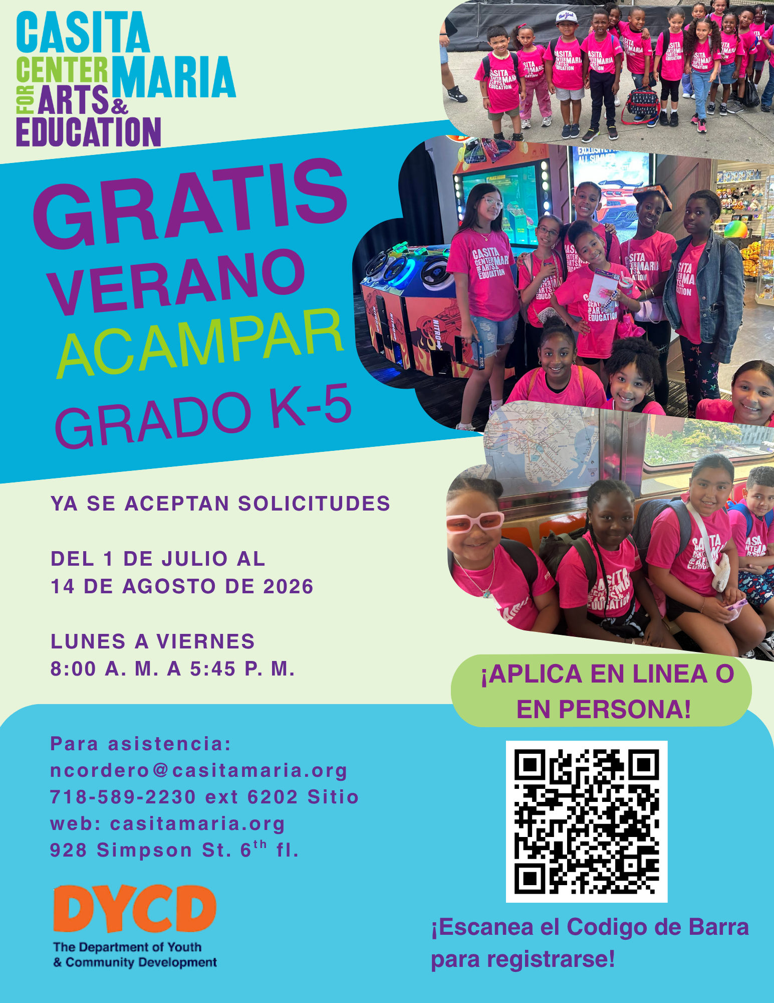 Los programas educativos de Casita María ofrecen programas extracurriculares y de verano para hasta 400 jóvenes desde el jardín de infantes hasta la escuela intermedia. Los programas se basan en un marco de Desarrollo Creativo de la Juventud que combina la educación artística con la asistencia académica y los principios positivos del desarrollo de la juventud para capacitar a los jóvenes para que alcancen su potencial como artistas, académicos y líderes. Todos los programas son gratuitos y funcionan después de la escuela de 2:30 a 6:00 p. m. Aceptamos participantes por orden de llegada, independientemente de la necesidad