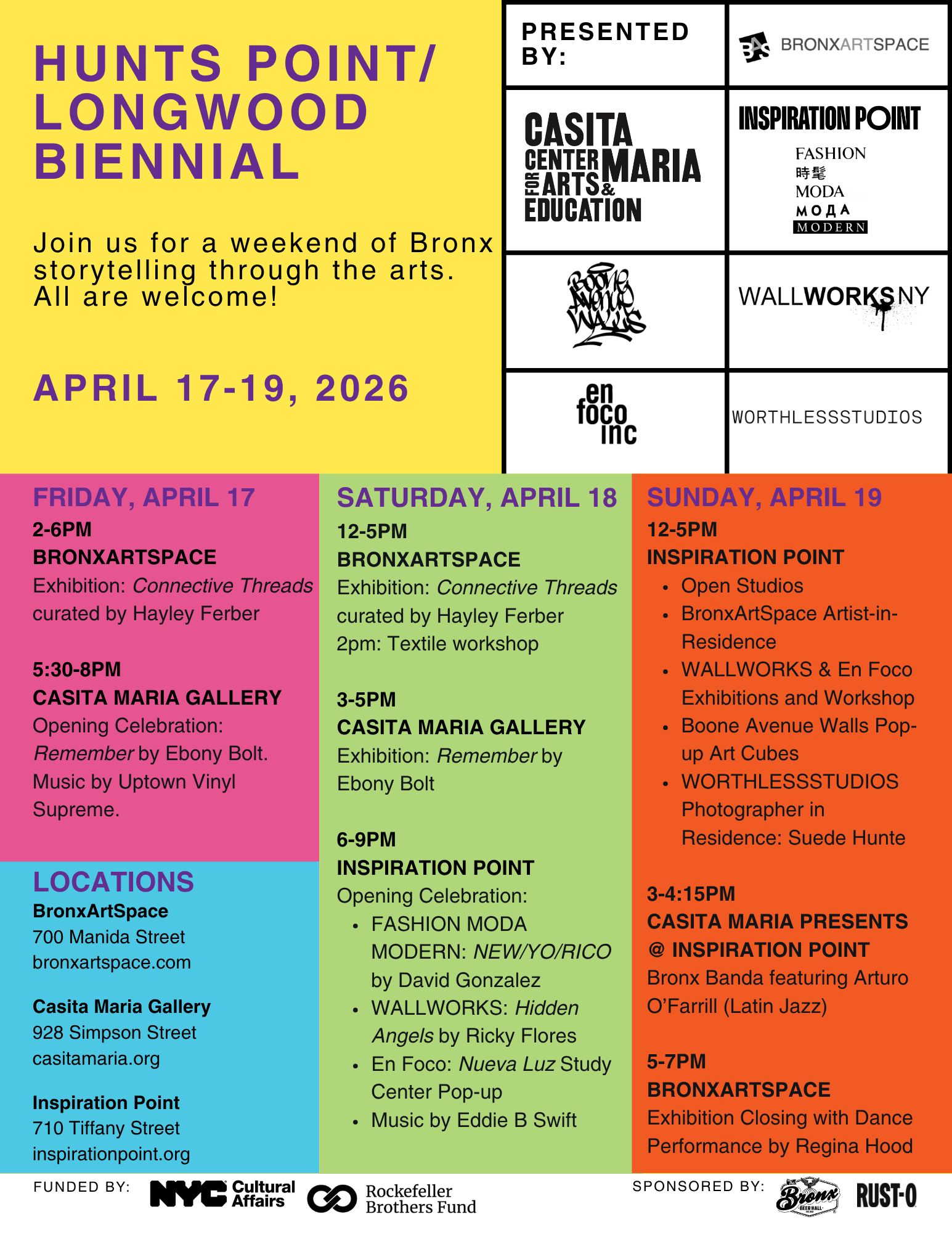 This April, BronxArtsSpace, Casita Maria Center for Arts & Education and Inspiration Point proudly present our first-ever Hunts Point/Longwood Biennial, a landmark cultural event taking place April 17–19. This initiative brings together a vibrant network of Bronx arts organizations, artists, curators, and community spaces in a shared celebration of creativity focused on storytelling across disciplines. Additional partners include: Boone Avenue Walls, En Foco, WALLWORKS, and WORTHLESSSTUDIOS.